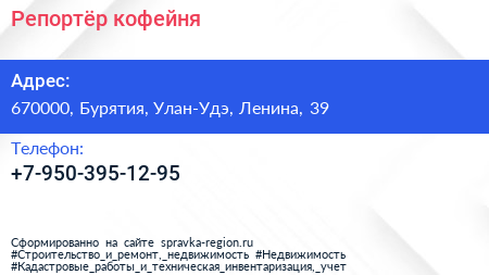 Репортёр, кофейня по адресу 670000, Бурятия, Улан-Удэ, Ленина, 39 в дальнейшем Организация, размещена в следующих категориях: