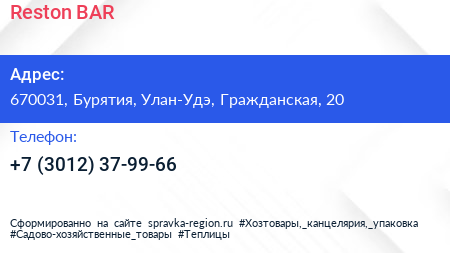 Reston BAR по адресу 670031, Бурятия, Улан-Удэ, Гражданская, 20 в дальнейшем Организация, размещена в следующих категориях:
