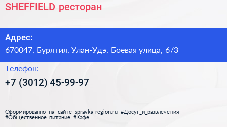 SHEFFIELD, ресторан по адресу 670047, Бурятия, Улан-Удэ, Боевая улица, 6/3 в дальнейшем Организация, размещена в следующих категориях:
