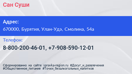 Сан Суши по адресу 670000, Бурятия, Улан-Удэ, Смолина, 54а в дальнейшем Организация, размещена в следующих категориях: