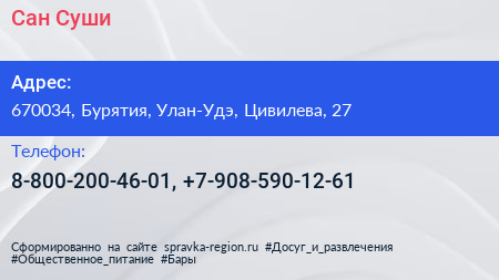 Сан Суши по адресу 670034, Бурятия, Улан-Удэ, Цивилева, 27 в дальнейшем Организация, размещена в следующих категориях: