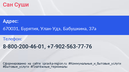 Сан Суши по адресу 670031, Бурятия, Улан-Удэ, Бабушкина, 37а в дальнейшем Организация, размещена в следующих категориях: