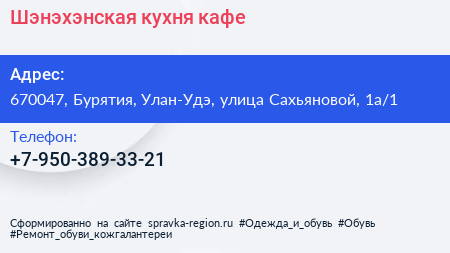 Шэнэхэнская кухня, кафе по адресу 670047, Бурятия, Улан-Удэ, улица Сахьяновой, 1а/1 в дальнейшем Организация, размещена в следующих категориях: