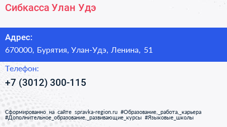 Сибкасса Улан-Удэ по адресу 670000, Бурятия, Улан-Удэ, Ленина, 51 в дальнейшем Организация, размещена в следующих категориях: