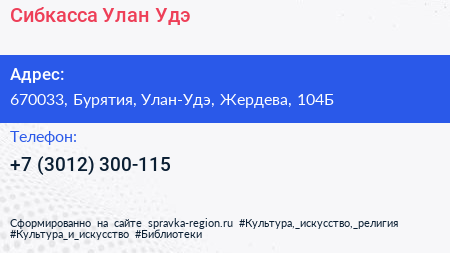 Сибкасса Улан-Удэ по адресу 670033, Бурятия, Улан-Удэ, Жердева, 104Б в дальнейшем Организация, размещена в следующих категориях: