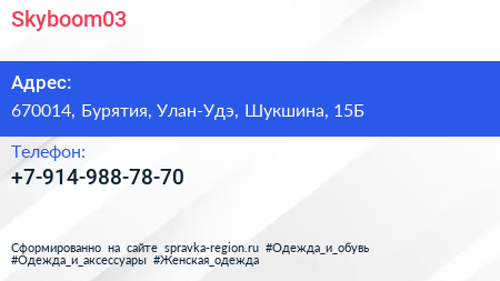 Skyboom03 по адресу 670014, Бурятия, Улан-Удэ, Шукшина, 15Б в дальнейшем Организация, размещена в следующих категориях: