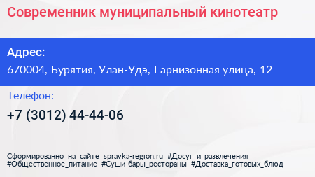 Современник, муниципальный кинотеатр по адресу 670004, Бурятия, Улан-Удэ, Гарнизонная улица, 12 в дальнейшем Организация, размещена в следующих категориях: