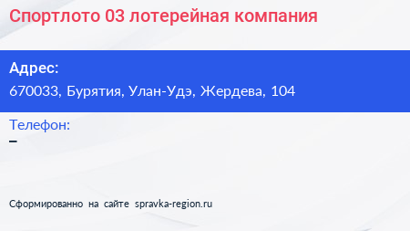 Спортлото 03, лотерейная компания по адресу 670033, Бурятия, Улан-Удэ, Жердева, 104 в дальнейшем Организация, размещена в следующих категориях: