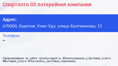 Спортлото 03, лотерейная компания по адресу 670000, Бурятия, Улан-Удэ, улица Балтахинова, 15 в дальнейшем Организация, размещена в следующих категориях: