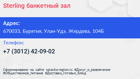 Sterling, банкетный зал по адресу 670033, Бурятия, Улан-Удэ, Жердева, 104Б в дальнейшем Организация, размещена в следующих категориях: