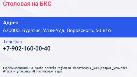 Столовая на БКС по адресу 670000, Бурятия, Улан-Удэ, Воровского, 50 к16 в дальнейшем Организация, размещена в следующих категориях: