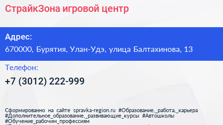 СтрайкЗона, игровой центр по адресу 670000, Бурятия, Улан-Удэ, улица Балтахинова, 13 в дальнейшем Организация, размещена в следующих категориях:
