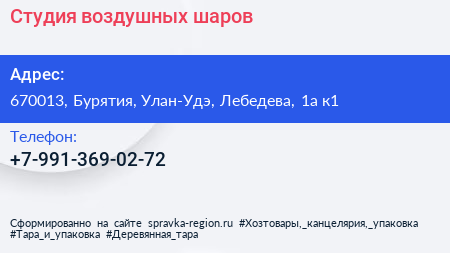 Студия воздушных шаров по адресу 670013, Бурятия, Улан-Удэ, Лебедева, 1а к1 в дальнейшем Организация, размещена в следующих категориях: