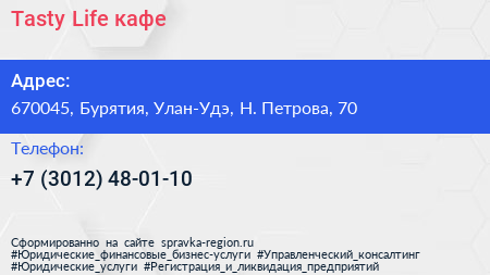 Tasty Life, кафе по адресу 670045, Бурятия, Улан-Удэ, Н. Петрова, 70 в дальнейшем Организация, размещена в следующих категориях: