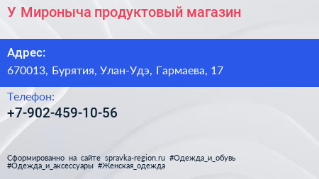 У Мироныча, продуктовый магазин по адресу 670013, Бурятия, Улан-Удэ, Гармаева, 17 в дальнейшем Организация, размещена в следующих категориях: