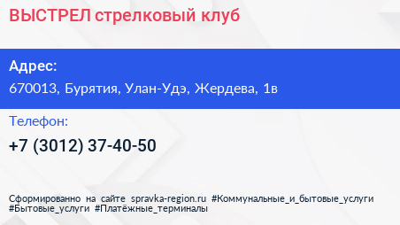ВЫСТРЕЛ, стрелковый клуб по адресу 670013, Бурятия, Улан-Удэ, Жердева, 1в в дальнейшем Организация, размещена в следующих категориях: