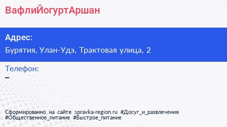 #ВафлиЙогуртАршан по адресу Бурятия, Улан-Удэ, Трактовая улица, 2 в дальнейшем Организация, размещена в следующих категориях: