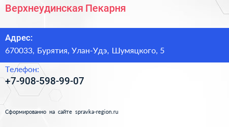 Верхнеудинская Пекарня по адресу 670033, Бурятия, Улан-Удэ, Шумяцкого, 5 в дальнейшем Организация, размещена в следующих категориях: