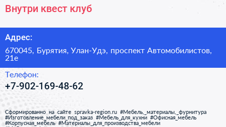 Внутри, квест-клуб по адресу 670045, Бурятия, Улан-Удэ, проспект Автомобилистов, 21е в дальнейшем Организация, размещена в следующих категориях: