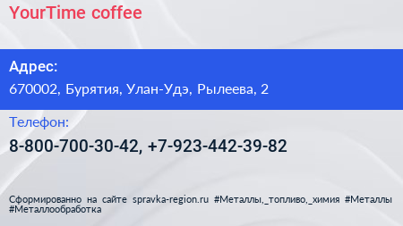 YourTime coffee по адресу 670002, Бурятия, Улан-Удэ, Рылеева, 2 в дальнейшем Организация, размещена в следующих категориях: