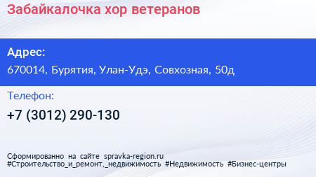 Забайкалочка, хор ветеранов по адресу 670014, Бурятия, Улан-Удэ, Совхозная, 50д в дальнейшем Организация, размещена в следующих категориях: