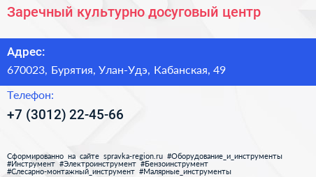 Заречный, культурно-досуговый центр по адресу 670023, Бурятия, Улан-Удэ, Кабанская, 49 в дальнейшем Организация, размещена в следующих категориях: