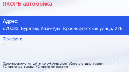 ЯКОРЬ, автомойка по адресу 670033, Бурятия, Улан-Удэ, Краснофлотская улица, 27Б в дальнейшем Организация, размещена в следующих категориях: