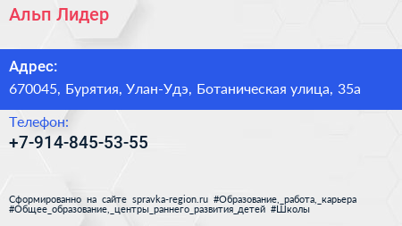 Альп Лидер по адресу 670045, Бурятия, Улан-Удэ, Ботаническая улица, 35а в дальнейшем Организация, размещена в следующих категориях: