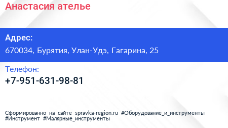 Анастасия, ателье по адресу 670034, Бурятия, Улан-Удэ, Гагарина, 25 в дальнейшем Организация, размещена в следующих категориях: