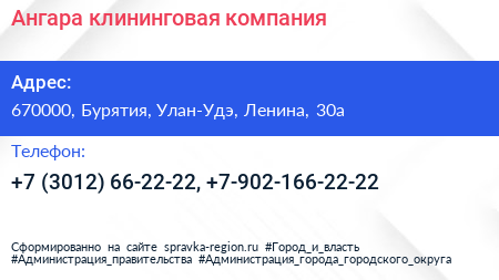Ангара, клининговая компания по адресу 670000, Бурятия, Улан-Удэ, Ленина, 30а в дальнейшем Организация, размещена в следующих категориях: