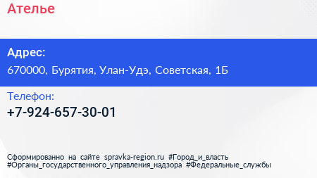 Ателье по адресу 670000, Бурятия, Улан-Удэ, Советская, 1Б в дальнейшем Организация, размещена в следующих категориях:
