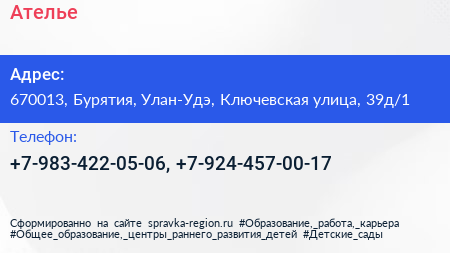 Ателье по адресу 670013, Бурятия, Улан-Удэ, Ключевская улица, 39д/1 в дальнейшем Организация, размещена в следующих категориях: