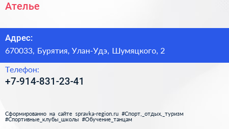 Ателье по адресу 670033, Бурятия, Улан-Удэ, Шумяцкого, 2 в дальнейшем Организация, размещена в следующих категориях: