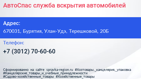 АвтоСпас, служба вскрытия автомобилей по адресу 670031, Бурятия, Улан-Удэ, Терешковой, 20Б в дальнейшем Организация, размещена в следующих категориях: