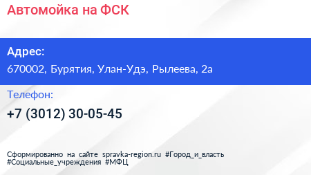 Автомойка на ФСК по адресу 670002, Бурятия, Улан-Удэ, Рылеева, 2а в дальнейшем Организация, размещена в следующих категориях: