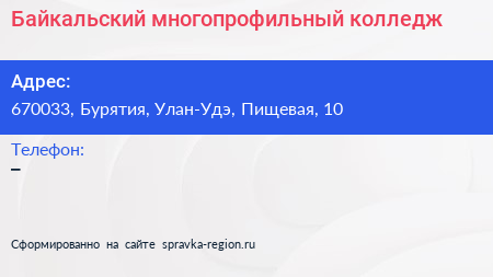 Байкальский многопрофильный колледж по адресу 670033, Бурятия, Улан-Удэ, Пищевая, 10 в дальнейшем Организация, размещена в следующих категориях: