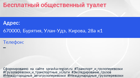 Бесплатный общественный туалет по адресу 670000, Бурятия, Улан-Удэ, Кирова, 28а к1 в дальнейшем Организация, размещена в следующих категориях: