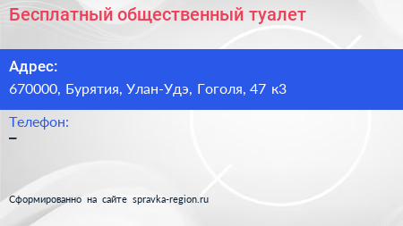 Бесплатный общественный туалет по адресу 670000, Бурятия, Улан-Удэ, Гоголя, 47 к3 в дальнейшем Организация, размещена в следующих категориях: