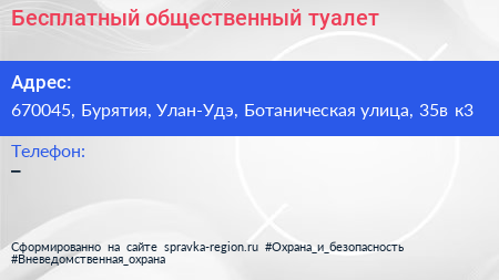 Бесплатный общественный туалет по адресу 670045, Бурятия, Улан-Удэ, Ботаническая улица, 35в к3 в дальнейшем Организация, размещена в следующих категориях: