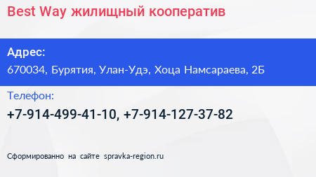 Best Way, жилищный кооператив по адресу 670034, Бурятия, Улан-Удэ, Хоца Намсараева, 2Б в дальнейшем Организация, размещена в следующих категориях: