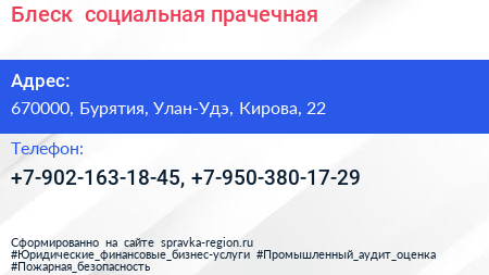 Блеск+, социальная прачечная по адресу 670000, Бурятия, Улан-Удэ, Кирова, 22 в дальнейшем Организация, размещена в следующих категориях: