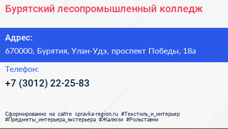 Бурятский лесопромышленный колледж по адресу 670000, Бурятия, Улан-Удэ, проспект Победы, 18а в дальнейшем Организация, размещена в следующих категориях: