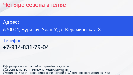 Четыре сезона, ателье по адресу 670004, Бурятия, Улан-Удэ, Керамическая, 3 в дальнейшем Организация, размещена в следующих категориях: