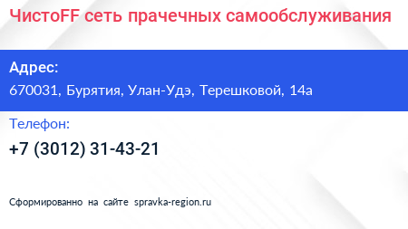 ЧистоFF, сеть прачечных самообслуживания по адресу 670031, Бурятия, Улан-Удэ, Терешковой, 14а в дальнейшем Организация, размещена в следующих категориях: