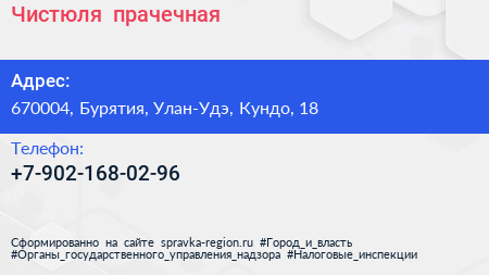 Чистюля+, прачечная по адресу 670004, Бурятия, Улан-Удэ, Кундо, 18 в дальнейшем Организация, размещена в следующих категориях: