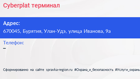Cyberplat, терминал по адресу 670045, Бурятия, Улан-Удэ, улица Иванова, 9а в дальнейшем Организация, размещена в следующих категориях: