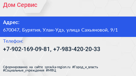 Дом-Сервис по адресу 670047, Бурятия, Улан-Удэ, улица Сахьяновой, 9/1 в дальнейшем Организация, размещена в следующих категориях: