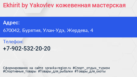 Ekhirit by Yakovlev, кожевенная мастерская по адресу 670042, Бурятия, Улан-Удэ, Жердева, 4 в дальнейшем Организация, размещена в следующих категориях: