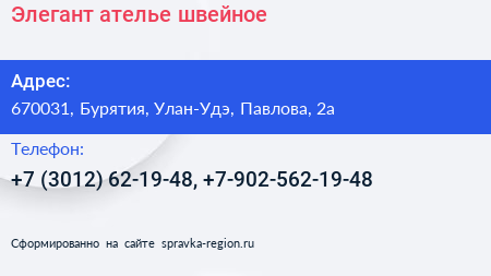 Элегант, ателье швейное по адресу 670031, Бурятия, Улан-Удэ, Павлова, 2а в дальнейшем Организация, размещена в следующих категориях: