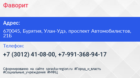 Фаворит по адресу 670045, Бурятия, Улан-Удэ, проспект Автомобилистов, 21Б в дальнейшем Организация, размещена в следующих категориях: